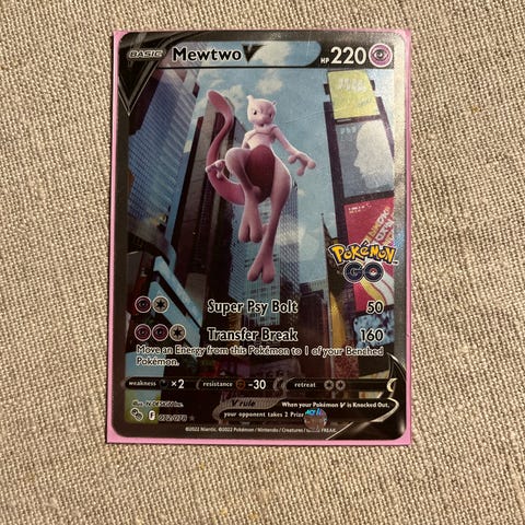Pokémon Mewtwo V Pokémon kort med holografisk design og 220 HP. Kortet viser Mewtwo med angrebene Super Psyk og Psykisk Kugle. Medfølgende er også et Pokémon Mew kort med 50 HP. Kortene er samleobjekter til Pokémon kortspillet.