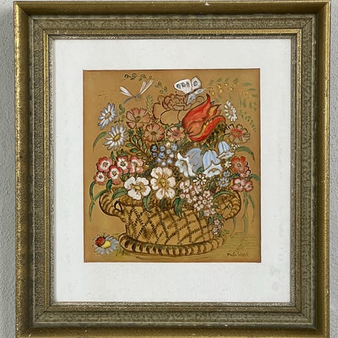 Wöhlk, Nikolaus. Schleswig 1887 Løjt Sønderskov, Aabenraa 1950. Akvarel med motiv af blomsterkurv med forskellige blomster og insekter.