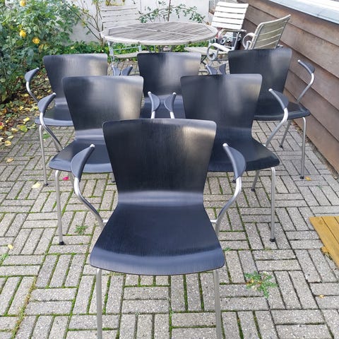 Vico Magistretti, VICO - VM3, Armstol, Designet af den verdenskendte italienske designer Vico Magistretti for Fritz Hansen i 1994. Siden udgået af produktion - samleobjekt. Firdelt sæde/ryg/armlæn i formbøjet sortlakeret asketræ, samlet med 'usynlige' stålbeslag. Stabilt alu-stel i satinfinish. Sæde-højde 47 cm, sædedybde 46 cm, samlet højde 78 cm, bredde 63,5 cm,