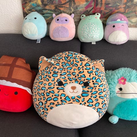 Squishmallows bamser sæt bestående af 5 forskellige figurer i blødt materiale. Sættet inkluderer bamser formet som en ananas, en frø, en fugl, en kat med citronmotiv og en flodhest. Hver bamse har en unik farve og design, velegnet til børn.