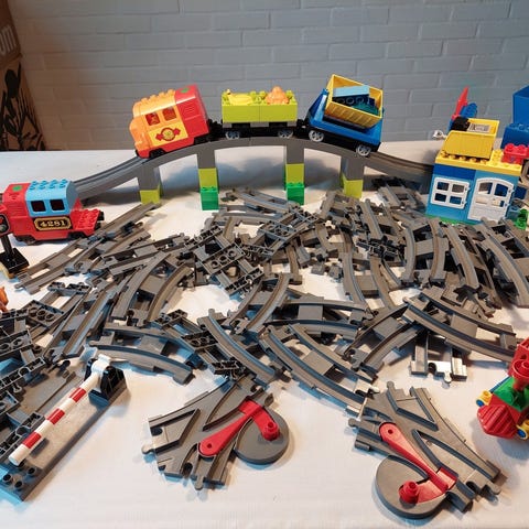 Lego Duplo sæt, med stort interaktivt lokalbanetog.