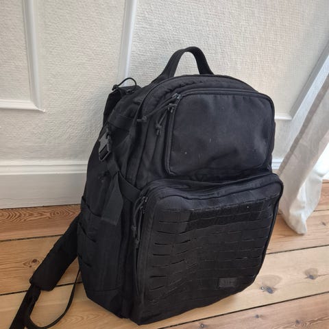 Tactical rygsæk i khaki farve lavet af nylon. Rygsækken har flere rum og lommer med lynlås, justerbare skulderstropper og er designet til praktisk opbevaring og transport af udstyr.
