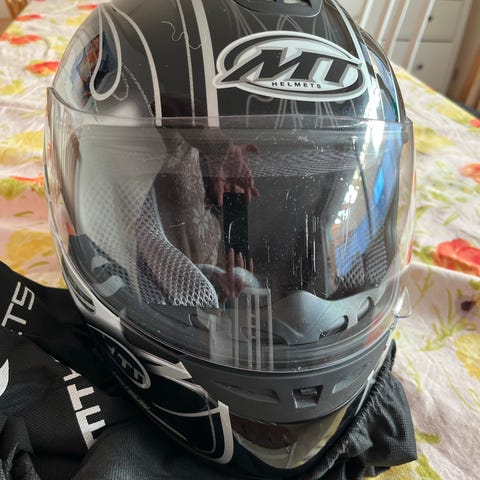 Rigtig fin matsort “MT Draken”, hjelm, størrelse XL. Den har få (max 1-2 cm) brugs-ridser hist og pist, men fejler ellers intet. Stof-pose for ekstra beskyttelse medfølger :-)