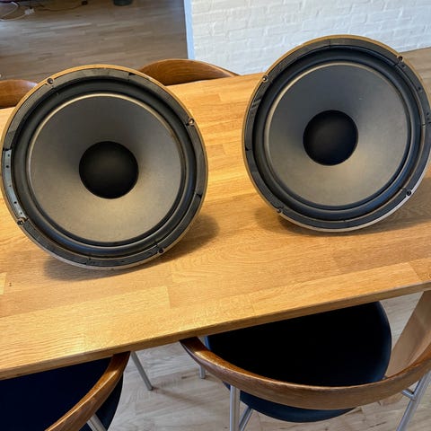 Sælges kun som sæt, det er lille skade på bunden af den ene højttaler som jeg har forsøgt at vise på den sidste billede. Skaden har ikke betydning for lyd gengivelsen, farve i amerikansk valnød finer.