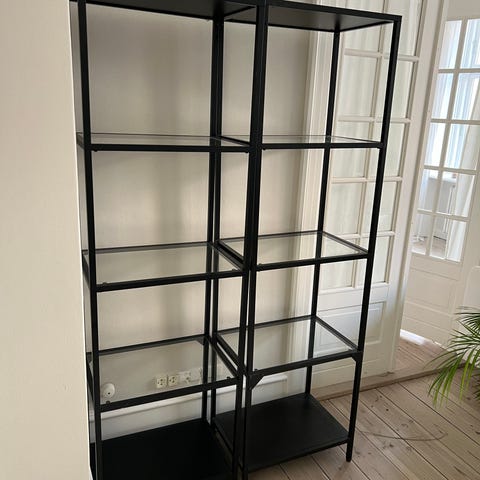 Flotte sorte stål reoler fra Ikea med glas hylder.