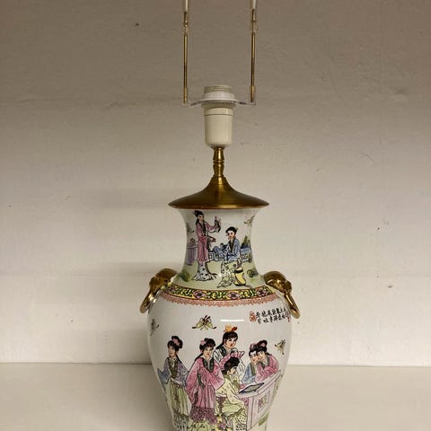 Der er tale om en kinesisk bordlampe i porcelæn, som oprindeligt kan have været en vase, der er blevet ombygget til en lampe.