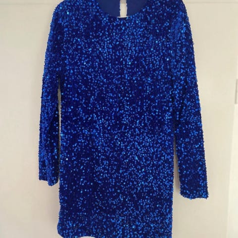 Festkjole i blå og gul i mærket Traffic People. Den er lavet i lyseblåt blondestof med gult stof under. Kjolen er længere bagved end foran. Den fremstår i meget fin stand, da den kun har været brugt få gange. Kommer fra røg- og dyrefrit hjem.