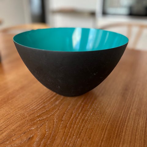 Normann Copenhagen skål med tyrkis inderside og sort yderside. Skålen har en diameter på cirka 38.5 cm.