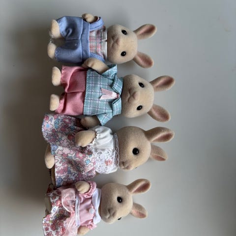 Kaniner i forskellige størrelser, 2 små, 4 mellemstore og 1 stor Sylvanian Families kanin sælges samlet. Der er i alt 7 figurer, og de kommer alle fra røgfrit hjem.