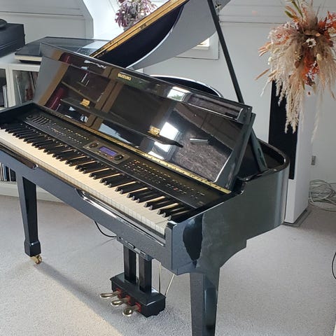 Elektronisk klaver med sort finish, 37 tangenter, indbygget kontrolpanel med forskellige funktioner og knapper, samt tilhørende sort klaverstol. Velegnet til begyndere og små børn.