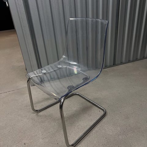 Gennemsigtig stol fra ikea. Stolen er brugt med brugsspor, dog kan den renses hvor det bliver gjort betydeligt mindre synligt. men ellers er det en rigtig fin og flot stol. Køberen skal selv afhente:)