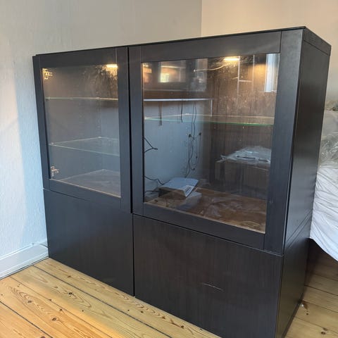 To dobbeltsektioner og en enkeltsektion. Sælges samlet. Den ene dobbeltsektion har vitrinelåger og glshylder. Den anden dobbeltsektion har hvide højglanslåger. Der er 3 huller på venstre side da de har været sat sammen med andet system.