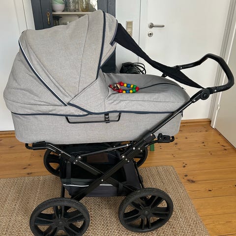 Odder barnevogn med stor kaleche og fire hjul