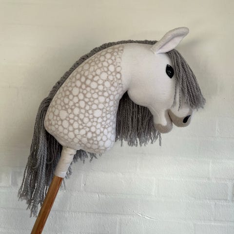 1 stk slm kæphest og 1 stk som påspændes barnet med sele. Sælges helst samlet. Der medfølger en del tilbehører til selv at ændre look på hestene. Eksp. Glasøjne osv. dermed følger også diverse seletøj osv.