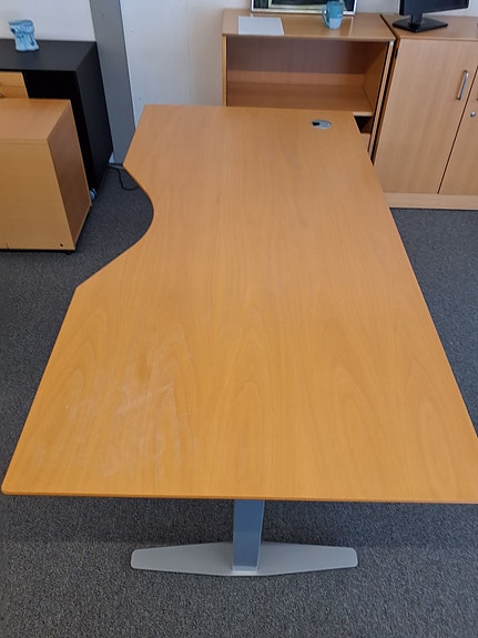 Bordpladerne har forskellige former og i lys træfinish, med en stabil metalstel i grå.