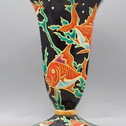 Disse vaser har en rigt detaljeret, flerfarvet blomsterdekoration, udført efter den traditionelle teknik med cloisonné-emalje, på en sprækket baggrund, der er karakteristisk for gamle Longwy-produktioner.