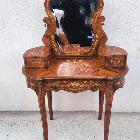 Den buede form, de detaljerede udskæringer og de bøjede ben antyder en barok- eller rokokostil.