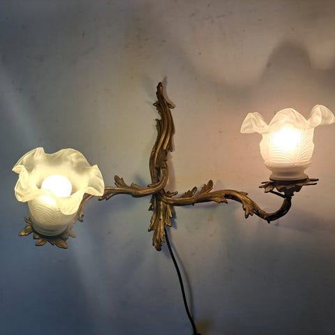 Fransk væglampe, omkring 1930–1940, lavet af patineret legering og glas, i god brugt stand med mindre alderssuse, 46 cm høj, 15 cm bred og 15 cm dyb, vejer 2,5 kg, med én fatning og i funktion, rigt dekoreret med en fransk kvinde og Louis XVI-elementer. Klik på den blå "gå til varen" knap, for at købe eller byde på denne vare. Den samlede pris vil blive vist inden du afgiver dit bud.