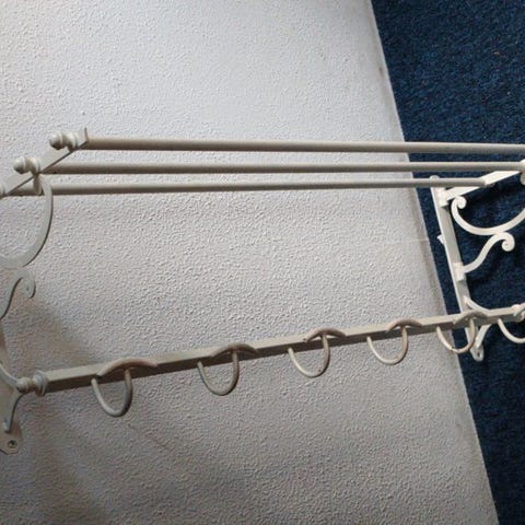 Krom vægkapstok med hylde og justerbare kroge, inspireret af antik stil, sandsynligvis 1970’erne–1980’erne, Frankrig, højde ca. 30 cm, bredde 70 cm, dybde 25 cm, vægt 4 kg, i god stand med mindre brugsspor og aldersmærker. Klik på den blå "gå til varen" knap, for at købe eller byde på denne vare. Den samlede pris vil blive vist inden du afgiver dit bud.