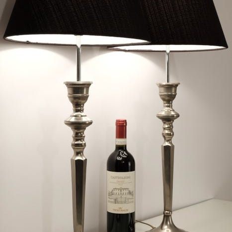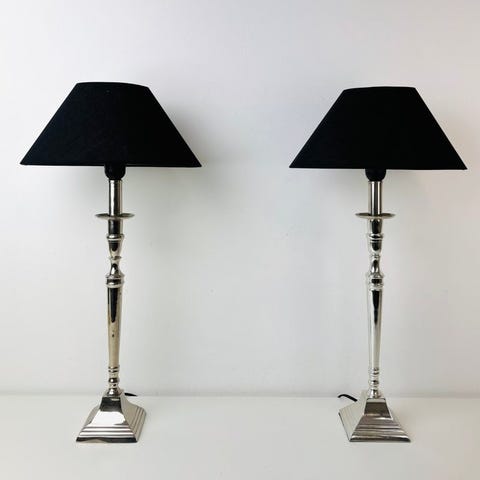 Et sæt af to store stilfulde high-end bordlamper i metal fra 1990’erne med sort satin-kolonne og fod, sølvfarvet kapitæl og detaljer, solid trappet fod og med nye store sorte rektangulære lampeskærme, fatning E27, samlet højde 65,5 cm, fod 14 x 14 cm, skærm 35 x 18 cm, kabel 145 cm, i udmærket stand og i funktion. Klik på den blå "gå til varen" knap, for at købe eller byde på denne vare. Den samlede pris vil blive vist inden du afgiver dit bud.