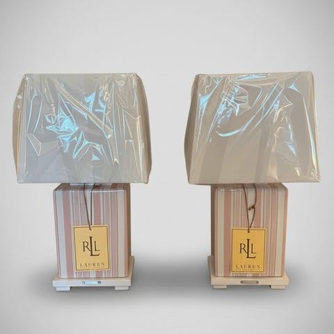 Anbragt på en mørkbejdset trægulvbase med et poleret messing “LAUREN” navneskilt, fremstår lamperne med en tydeligt luksuriøs og elegant udseende, egnet både som funktionelt belysning og som dekorative kunstgenstande. De originale hvide stofskærme forbliver forseglet i