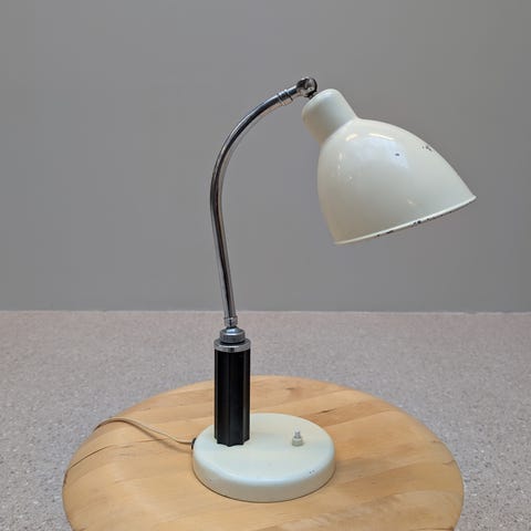 Moderne aluminiumsbordlampe med et minimalistisk Bauhaus-inspireret design af Christian Dell som en hyldest til Kaiser Idell Luxus; hvid orienterbar skærm, 1,3 m ledning, fodkontakt og dimensioner 33 cm bred, 43 cm høj, 33 cm dyb; i fungerer tilstand og som ny. Klik på den blå "gå til varen" knap, for at købe eller byde på denne vare. Den samlede pris vil blive vist inden du afgiver dit bud.