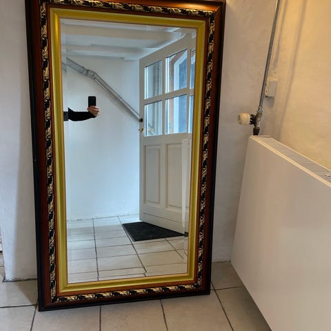 Ældre spejl af træ med bladguld, oprindelse Frankrig, skønnet periode 1940–1950, ydre mål 88 cm højde × 60 cm bredde × 6 cm dybde, vægt 5 kg, i god stand med nogle slid og alderspletter. Klik på den blå "gå til varen" knap, for at købe eller byde på denne vare. Den samlede pris vil blive vist inden du afgiver dit bud.
