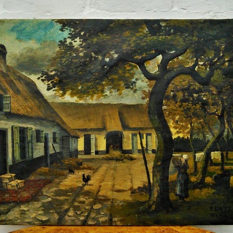 Skovstien (Olie på panel): En idyllisk scene med majestætiske træer og en mor med sit barn, der går en tur ved en bæk. Dette værk skiller sig ud gennem sin mesterligt anvendte impasto-teknik med en paletkniv, hvilket giver maleriet en vidunderlig tekstur og