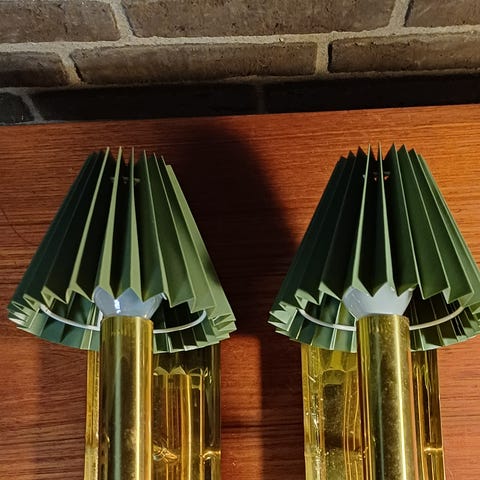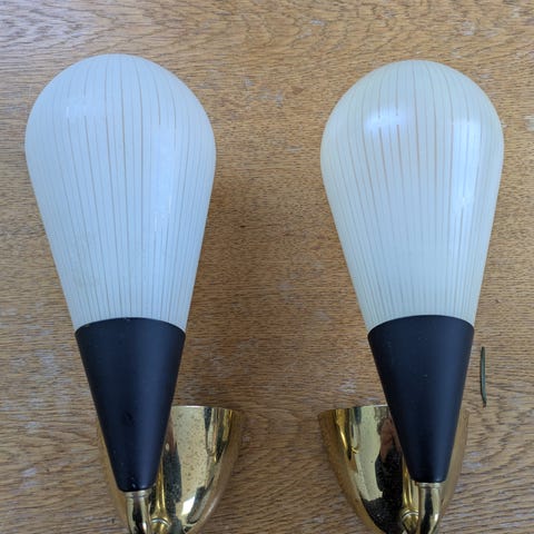 Et par væglamper af messing med krystalvedhæng, fremstillet i Italien, ca. 1960–1970, dimensioner 51 x 22 x 12 cm, i rimelig brugt stand med muligvis nogle små dele mangler, i funktion. Klik på den blå "gå til varen" knap, for at købe eller byde på denne vare. Den samlede pris vil blive vist inden du afgiver dit bud.