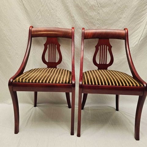 Et par elegante lænestole i Luigi XV-stil, helt håndskårne i massivt træ, har et eksklusivt stof, og er samlet set i god stand.