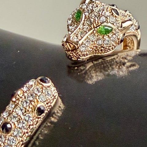 Elegant inspiration Cartier Panther guldbelagt cocktail sæt: halskæde, armbånd, øreringe og ring.