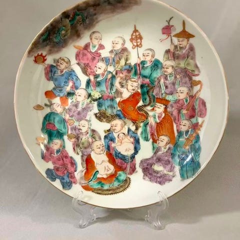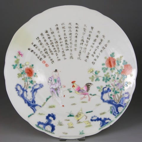 Famille rose tallerken med figurer og fortællingsscener. - 20. århundrede