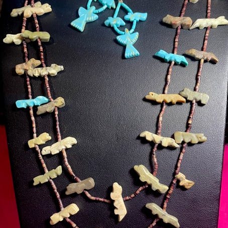 Indfødt amerikansk Zuni-sølv halskæde med fuglefætish, matchende øreringe og turkisdetaljer. Samlingen inkluderer også et udvalg af udskårne sten- og regnbueabalon-fugle, i alt 14. Zuni-fætishs er traditionelle udskæringer, der repræsenterer dyrespirits, og de menes at indkapsle kraften og karakteristikaene fra det dyr, de forestiller. De røde øjne er et karakteristisk træk i Zuni-udskæringer.