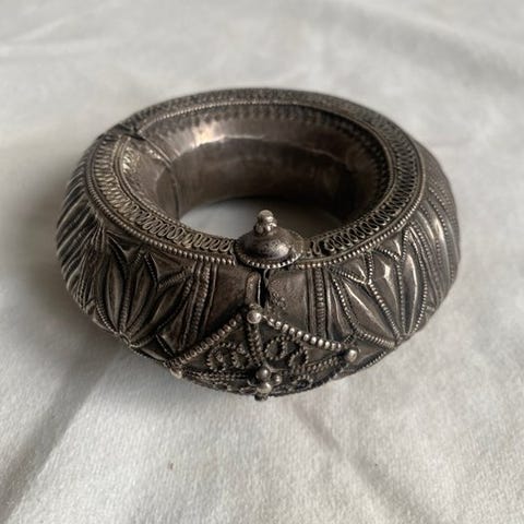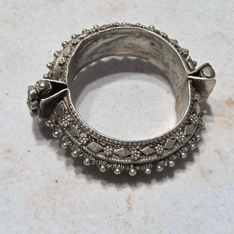 Sølvarmbånd fra Oman af Beduin-oprindelse med turkoserem cabochon, vægt 58 g, indvendig diameter 5,5 cm, omkreds 17 cm, højde 3 cm, dateret til begyndelsen af det 20. århundrede, i god brugt stand. Klik på den blå "gå til varen" knap, for at købe eller byde på denne vare. Den samlede pris vil blive vist inden du afgiver dit bud.