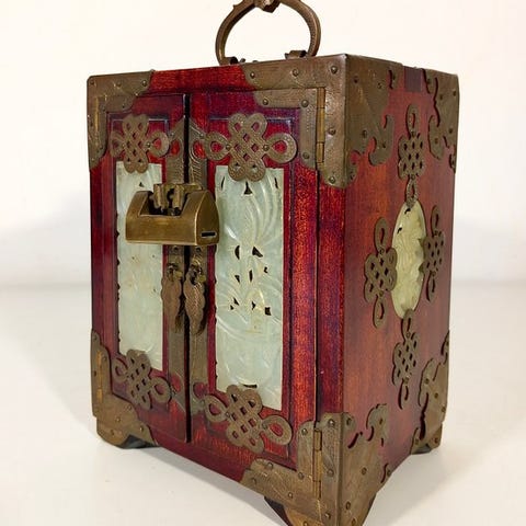 Træ juvelæske fra Ideko Atelier Weihs, Tyskland, fra 1850–1900, lakkeringsarbejde, motiv med frugttræ og to ænder, mørkt velour indvendigt, mål 7,5 × 19,5 × 12,5 cm, vægt 1 kg, i god brugt stand. Klik på den blå "gå til varen" knap, for at købe eller byde på denne vare. Den samlede pris vil blive vist inden du afgiver dit bud.