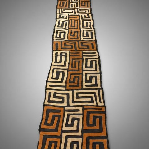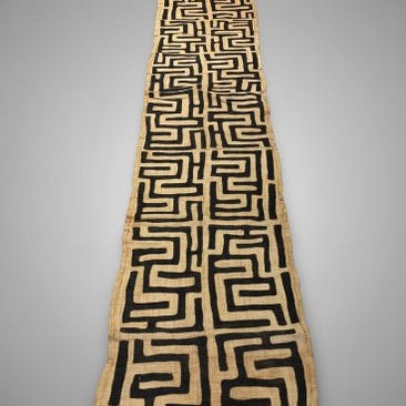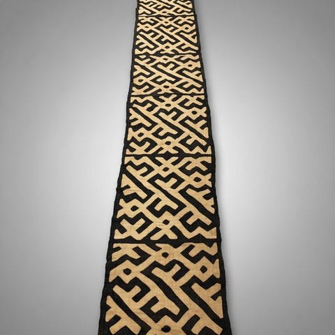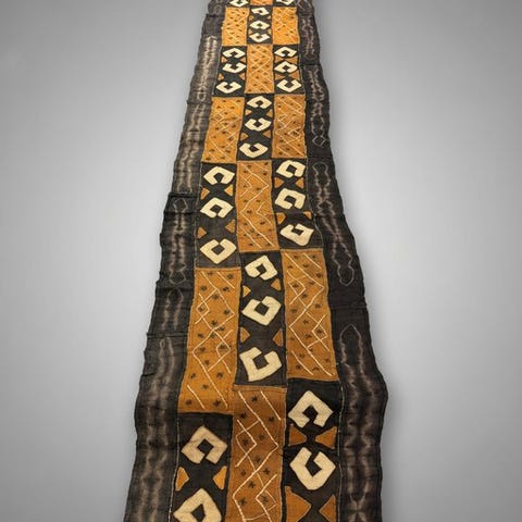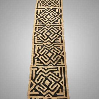 Kuba tekstil fra Congo, Shoowa-Kuba, dateret 1980–1990, 520 × 100 cm, i god stand med enkelte slidmærker og pletter pga. alder, fra en belgisk privat samling. Klik på den blå "gå til varen" knap, for at købe eller byde på denne vare. Den samlede pris vil blive vist inden du afgiver dit bud.