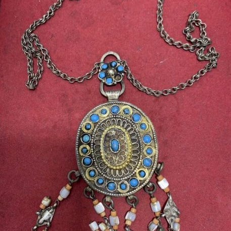 Dette er en smuk traditionel etnisk halskæde fra Centralasien / Afghanistan / Kuchi / Turkoman-regionen. Det er en påstandstribalhalskæde, håndlavet med stærk kulturel karakter. Disse bæres ofte ved traditionelle danse, bryllupper eller som brudegave. 42 cm. 400 g.