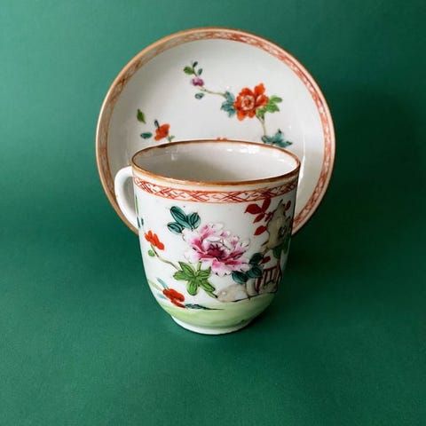 Et par grønfarvede kopper med dragemotiv og seks-tegns blå-hvidt mærke.