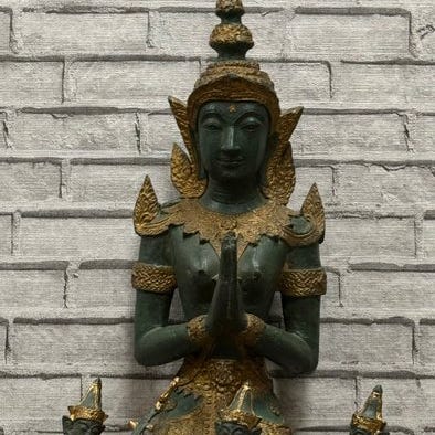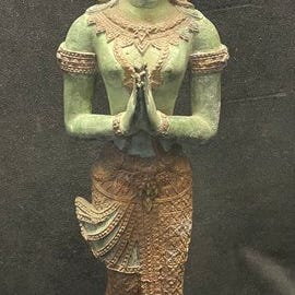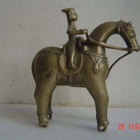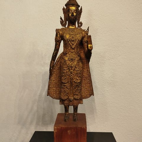 Bronzeskulptur af Krishna Venugopala, der spiller fløjte, Indien, Orissa, det 17. til 18. århundrede. Guddommen er afbildet stående i tribhanga-stilling, med det krydsede ben foran, på en trinvis base, rytmisk dekoreret med en perlefrise og en kronkrans af pétaler. Den bærer en let smykkeprydning med perler (fløjten mangler). Smuk patina og en meget elegant holdning.