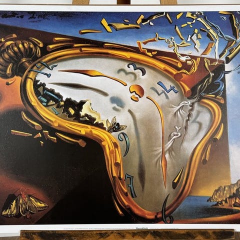Dette værk af Salvador Dalí, valgt som billede til udstillingen 'Max Ernst og hans surrealistiske venner' (Rom, Museo del Corso, 2002), indkapsler den catalanske mester’s visionære kraft. De forlængede figurer og de forvrængede skygger står frem mod et ørkenagtigt og mentalt landskab, hvor tiden — repræsenteret ved den bløde ur — bliver et symbol på angst og opløsning. Det menneskelige element smelter sammen med arkitekturen i en scene, der vækker ofring, metamorfose og forestående afslutning.