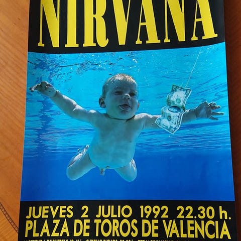 Fremragende plakat af Nirvana-koncerten, der blev afholdt i Valencia i 1992. Den måler 50x35 cm. Plakaten gengiver forsiden af et af deres albums. Officielt koncertstempel.
