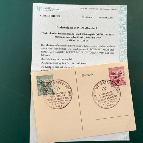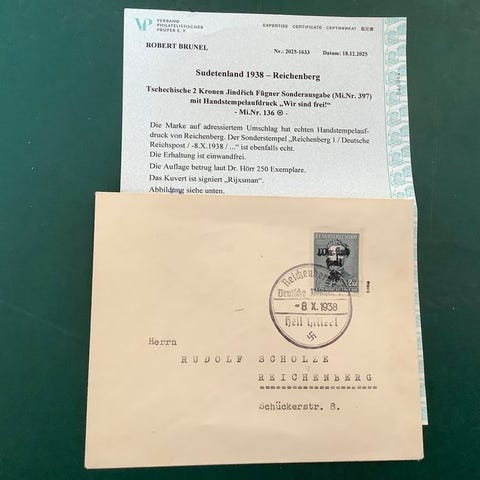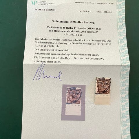 Geografisk oprindelse Böhmen og Mähren; Fra 1938; Tilstand præget; Certifikat Brunel dateret 18.12.2025; Michel katalognummer 7, 9 og 63; Titel: Karlsbad: tre frimærker med Wir sind frei frimærker på filatelistisk brev. Klik på den blå "gå til varen" knap, for at købe eller byde på denne vare. Den samlede pris vil blive vist inden du afgiver dit bud.