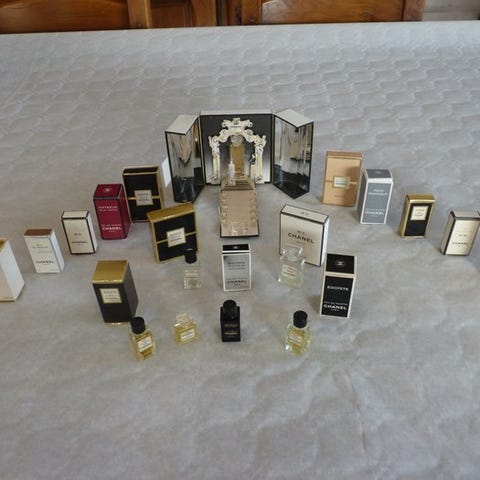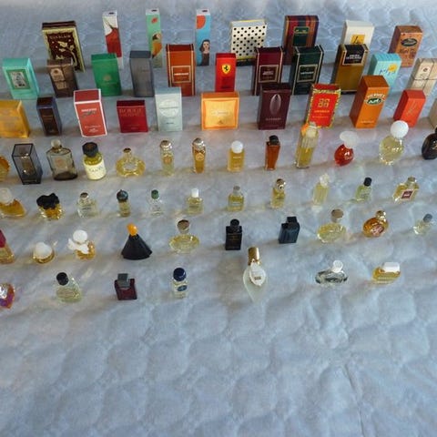 Flot sæt med 76 parfume-miniatyrer, hvoraf 37 har deres originale æske.