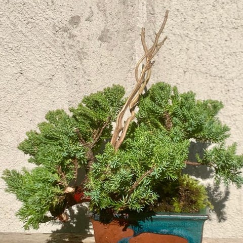 Bonsai af stedsegrøn Juniperus procumbens nana med to stammer i cascadeform, evergreen, træhøjde 7 cm, stammediameter 3 cm, dybde 34 cm, potte 23 x 10 x 4 cm, oprindelse Japan. Klik på den blå "gå til varen" knap, for at købe eller byde på denne vare. Den samlede pris vil blive vist inden du afgiver dit bud.