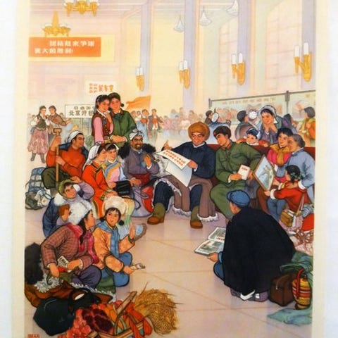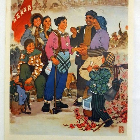 Original kinesiske propaganda-plakat fra 1975 'Kijk verheugd naar de (jonge) generatie van de Commune' (Xi kan gongshe xin yidai) af Wang Wenfang. Opført i Landsberger-samlingen under kodenummer BG E17/218.