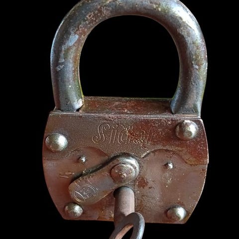 Gammelt stort lås i stål fra Frankrig, cirka 1850–1900, i god stand med slid og patina, nøgle medfølger og fungerer godt. Klik på den blå "gå til varen" knap, for at købe eller byde på denne vare. Den samlede pris vil blive vist inden du afgiver dit bud.