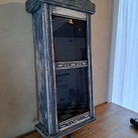 Skabet er lavet af metal, med mellemgulv og 4 fod-elementer.