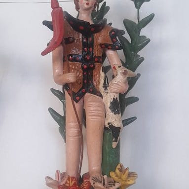 Tøjet er fint beklædt med 24 karat guldblad, håndpåført, hvilket giver skulpturen en værdifuld og unik karakter, fremhæver foldninger og volumener i klædet. Busten hviler på en sort metaldbase med en central støtte, en løsning der sikrer stabilitet og samtidig et rent og moderne design,
