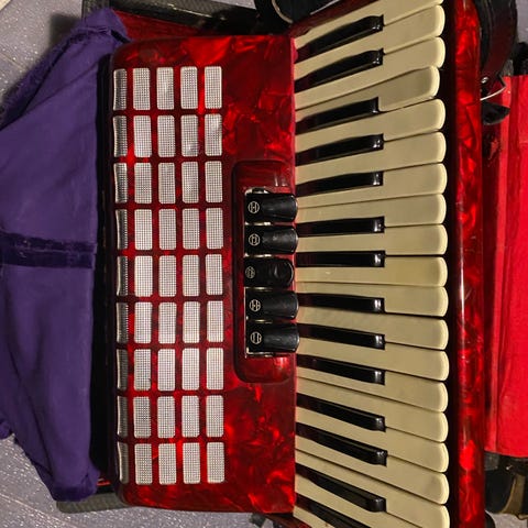 Meget flot piano-accordeon fra Galanti med 80 bas. Har ingen revner eller ridser. Alle elementer er på plads. Den rødkirsebærfarvede finish er meget behagelig. Alle 80 bas er i meget god stand.