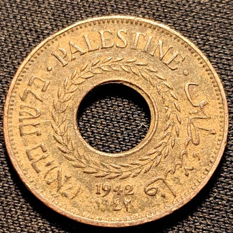 Bronzemønt udstedt under det britiske mandat i Palæstina, en periode præget af en kompleks administrativ og kulturel sameksistens, hvilket tydeligt afspejles i mønten. Den tredobbelte sprogbrug af inskriptionerne — engelsk, arabisk og hebraisk — gør denne udgivelse til et historisk dokument af stor betydning. Bagsiden viser olivengrenen, et universelt symbol på fred, dybt forankret i regionen, udført med et enkelt men
